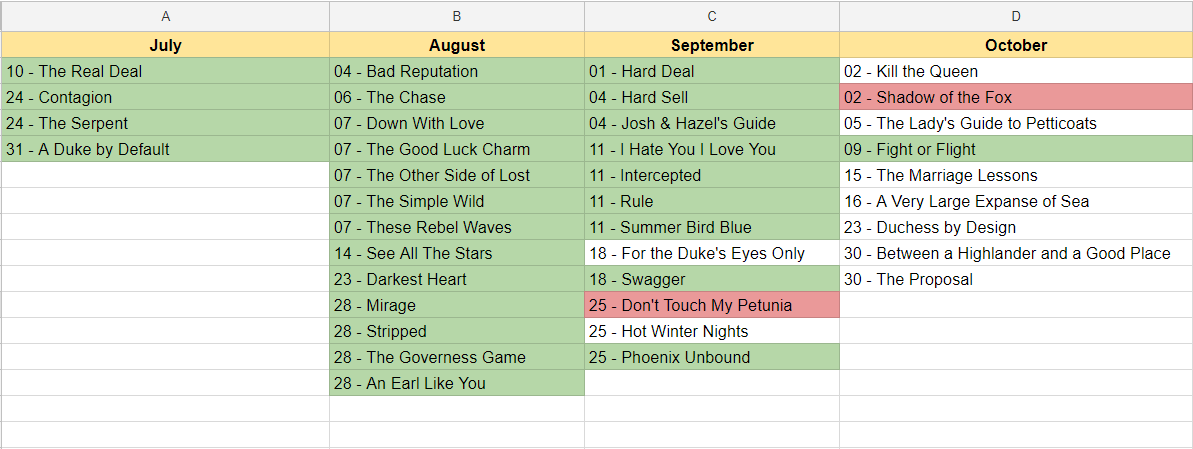 What do I mean by organized mood reader? I have a spreadsheet organized by months where I classify all the ARCs that I receive. Below is a snippet of my spreadsheet: